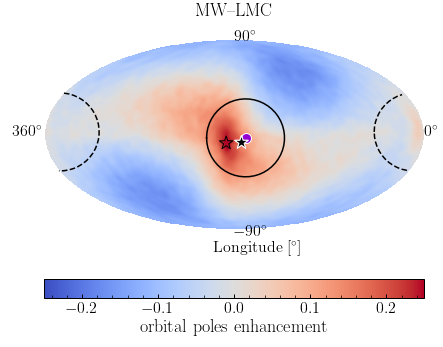 | In this paper, we study the influence of the LMC in inducing co-rotation (clustering of orbital poles) patterns in the halo of the MW. The motivation behind this is that we know that a significant fraction of the MW satellite galaxies are co-rotating in a thin plane. Such a configuration seems to be rare in the Universe, that’s why this is called the “planes of Satellites problem”. We found that because the LMC moves the MW’s inner halo (including the MW’s disk) relative to the outer halo particles in the outer halo would have an apparent co-rotation motion. The co-rotation seen in the satellite galaxies of the MW could be evidence of this apparent motion. | ![]() |